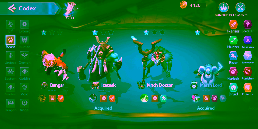 Berikutnya ada combo Beast yang juga sempat menjadi META di season sebelumnya. Pada season 5 sekarang ini, combo 4 Beast mengalami perubahan yaitu pada efeknya. Efeknya yaitu setiap hero yang men-summon peliharaan/pasukannya akan menambah damage semua pasukan. Dengan kata lain, semakin banyak peliharaan yang dipanggil damage semua pasukan juga semakin besar. Itulah mengapa combo Beast sekarang ini bisa dibilang menjadi combo META untuk season 5 ini. Hero yang sering dipakai untuk mengaktifkan combo 4 Beast ini adalah Ice Tusk, Bangar, Marshlord, dan Night Owl. Ice Tusk dan Bangar berperan sebagai tank dilini depan, sedangkan Marshlord dan Night Owl yang akan menjadi hitter dan memanggil peliharaannya untuk menambah damage pasukan. -