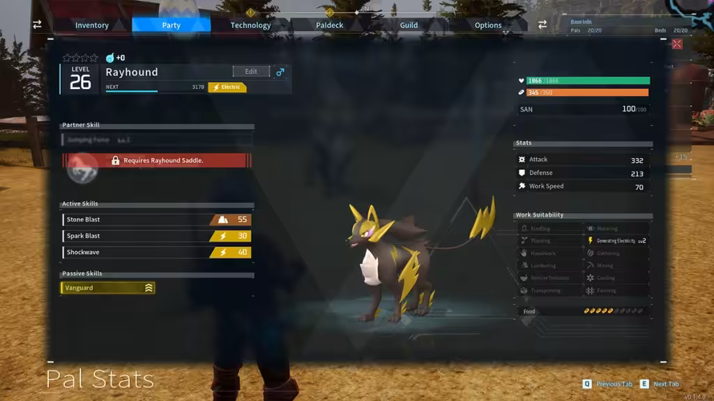 Pal yang satu ini cukup cepat dengan kecepatan berjalan 700 serta sprint di 1150 dan mampu melakukan double jump. Pal terlihat cukup keren. Saddle Rayhound juga dapat dibuat pada level 26 sehingga dirinya merupakan pal yang cukup bagus pada mid game.