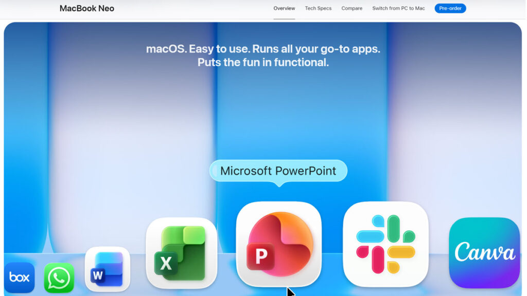 Lalui informasi yang kami dapatkan dari WindowsLatest, langkah cerdik Apple pancing pengguna Windows ini terlihat sangat jelas di bagian “Highlights” pada halaman resmi MacBook Neo. Bukannya memamerkan aplikasi produktivitas milik sendiri seperti Pages atau Keynote, Apple justru menonjolkan Microsoft PowerPoint, Excel, dan Word.