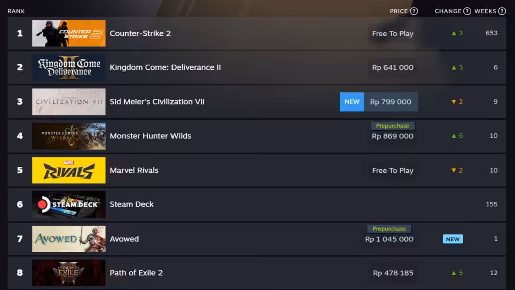Berdasarkan dari data Top Selling di Amerika Serikat, game Avowed kini berada di posisi ke-7 langsung di Steam. Daftar ini mencakup beberapa game baru seperti Sid Meier’s Civilization VII dan Kingdom Come Deliverance 2.