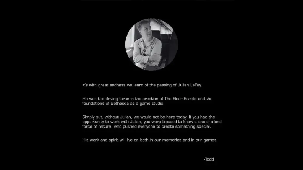 Todd Howard yang menjadi pimpinan Bethesda menyampaikan pesan mengenai kepergian Julian LeFay. Pesan ini ia tulis melalui akun Twitter/X Bethesda Game Studios. Dan Todd Howard memiliki rasa hormat yang tinggi terhadapnya.