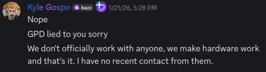 Muncul dugaan bahwa GPD mungkin telah menjadi korban penipuan oleh oknum yang mengaku sebagai tim pengembang, atau mereka sengaja menyebarkan misinformasi. Hingga kini, postingan klaim sepihak tersebut masih tersedia di media sosial, meski pihak Bazzite sudah memberikan teguran keras secara publik.
