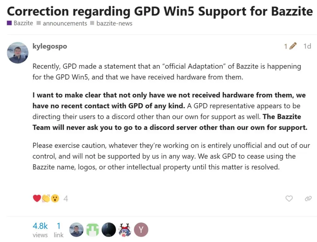 Kabar mengenai Bazzite bantah klaim GPD ini muncul setelah GPD mengarahkan pengguna ke server Discord eksternal untuk berkonsultasi dengan perwakilan palsu. Tim Bazzite juga memperingatkan awam bahwa mereka tidak akan memberikan dukungan teknis untuk pekerjaan di luar kontrol tim internal Bazzite sendiri demi keamanan.