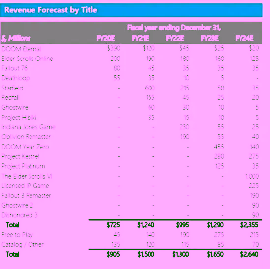 Tak hanya Starfield, beberapa game lain yang diterbitkan oleh Bethesda juga ikut terlihat proyeksi pendapatannya. Mulai dari Doom Eternal yang diharapkan mendapat $390 juta di tahun pertama, Fallout 76 yang diharap capai $80 juta di tahun 2020, dan Deathloop yang diharap capai $55 juta yang menjadi angka rendah tetapi diekspektasi melihat itu menjadi IP baru.