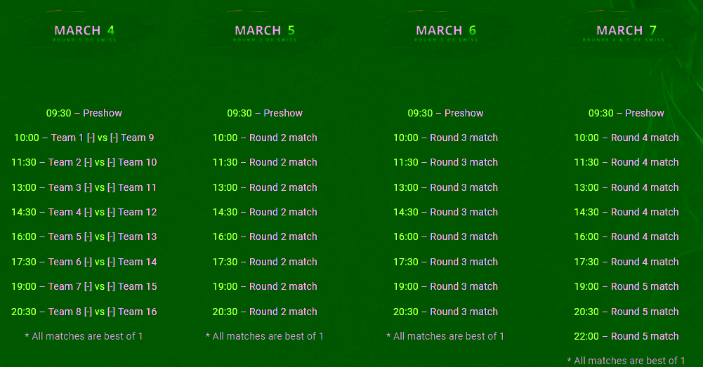 Dimana 16 tim yang sudah terkualifikasi melalui undangan langsung ataupun kualifikasi terbuka akan diadu dalam babak Swiss yang akan mempertemukan mereka dengan lawan yang dianggap seimbang. Dengan format Best of 1 setiap pertandingannya, skor dari hasil tiap pertandingan akan mempengaruhi siapa yang akan menjadi lawan mereka selanjutnya.