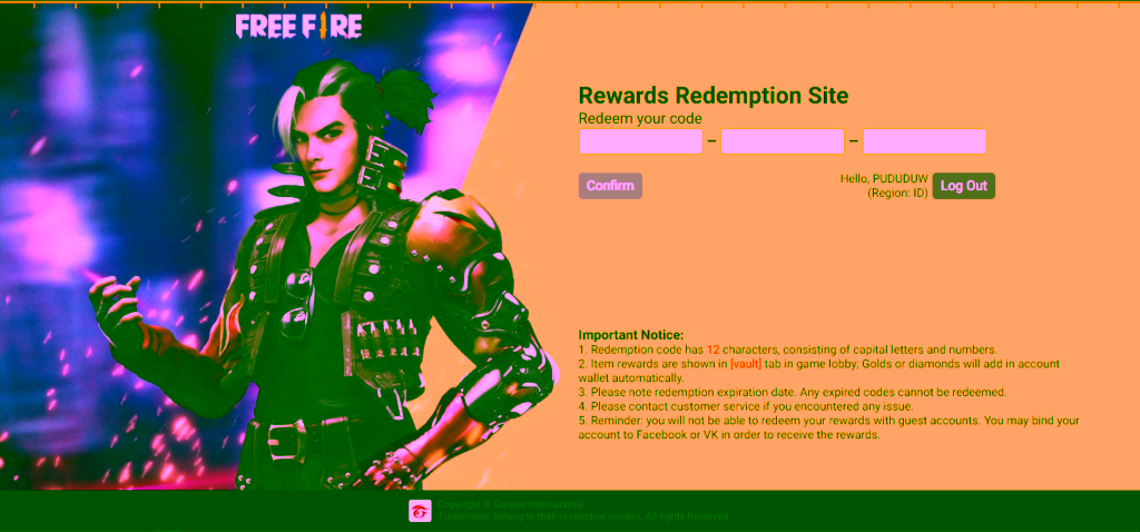 Cara penukaran kode / redeem code pada event kali ini sangat mudah. Kunjungi situs Official Garena Free Fire, log in menggunakan akun Garena Free Fire yang digunakan untuk masuk ke dalam game. Pastikan kembali akun yang digunakan untuk redeem code sudah tertaut dengan akun yang digunakan untuk bermain dalam game, ya..