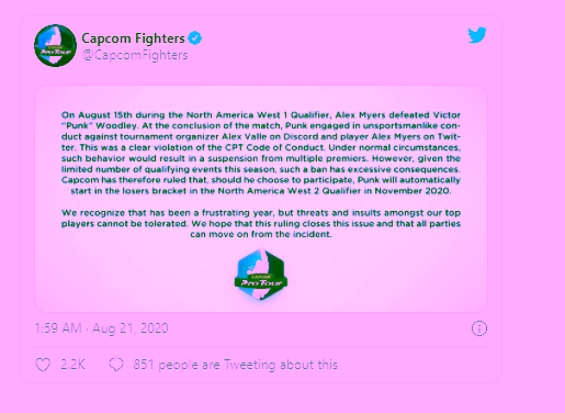 Hal tersebut tentunya segera mendapatkan hukuman dari pihak Capcom. Beberapa kata hinaan juga telah dihapus. Akan tetapi, pihak Capcom memberikan hukuman yang dianggap kontroversi. Di mana Punk dimasukkan dalam kelompok loser bracket (grup orang kalah) pada turnamen North America West Qualifier 2 november 2020.