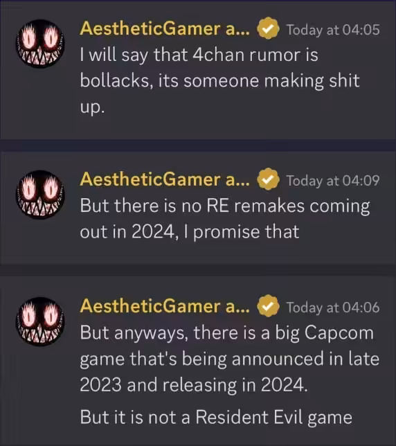 Menurut informasi dari leaker AestheticGamer alias Dusk Golem, yang baru-baru ini membantah rumor adanya remake Resident Evil Code: Veronica yang berasal dari 4chan. Dipertegas pula olehnya bahwa tahun 2024 nanti tidak akan ada peluncuran remake Resident Evil apapun.