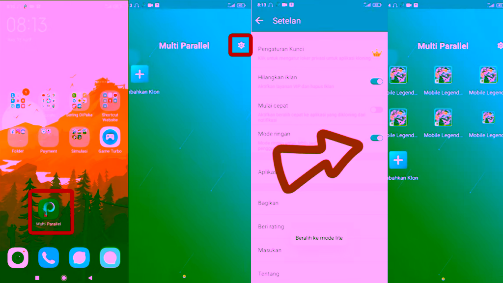 - Setelah Multi Parallel terbuka, maka kalian harus Setting terlebih dahulu. Hidupkan ‘Mode Ringan’ di Multi Parallel agar tidak perlu download aplikasi.