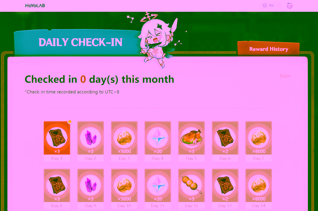 Dengan melakukan Check-In website tersebut, kalian bisa mendapatkan berbagai hadiah menarik dari miHoYo/HoYoverse. Hadiah tersebut berupa Adventurer’s Experience, Mora, Primogem dan masih banyak lagi. Dengan begini kalian akan terbantu mengumpulkan Primogem dengan melakukan daily login pada hari-hari tertentu selama 1 bulan.