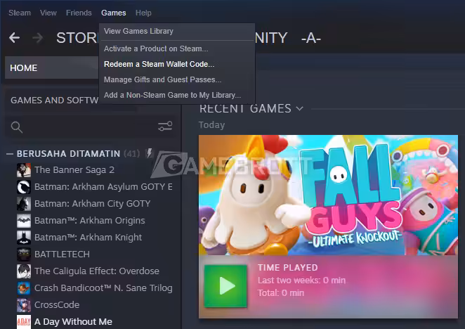 Jika kamu miliki aplikasi Steam yang mana bisa didownload melalui link berikut dan telah login. Maka kamu hanya perlu klik menu Games > Redeem a Steam Wallet Code. Masukkan kodenya lalu klik continue.