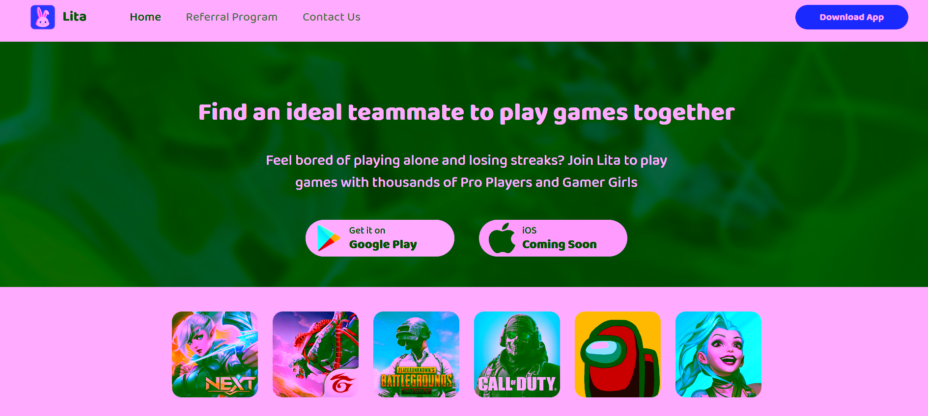 Lita sendiri ialah aplikasi sosial media yang menyediakan ratusan bahkan ke depannya ribuan Jasa Teman Mabar untuk bermain game online. Jasa teman mabar dari “Lita” terdiri dari cewek-cewek gamers cantik dan juga Pro Player yang siap menemani kalian semua untuk mabar sambil On Mic.