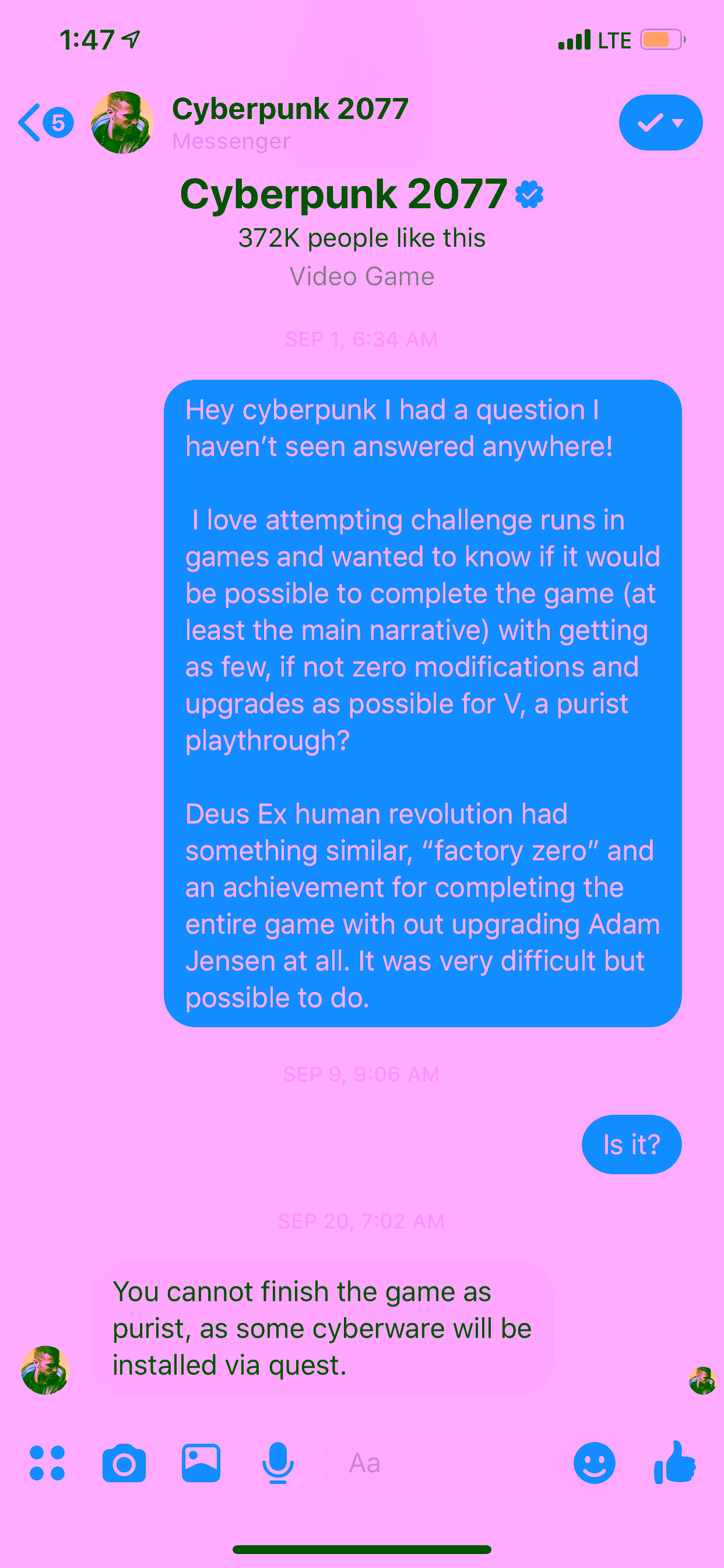 Seorang fan bertanya ke akun official Facebook Cyberpunk 2077. Disini dia menanyakan apakah akan ada opsi dimana gamer dapat menyelesaikan game tanpa menggunakan Cyberware. Cyberware yang dimaksud adalah salah satu fitur game ini yang menggunakan teknologi cybernetic yang disematkan ke dalam tubuh manusia secara permanen melalui sistem saraf. Tetapi, jawaban yang diperolah adalah tidak.