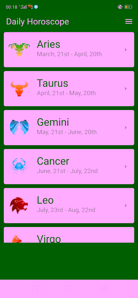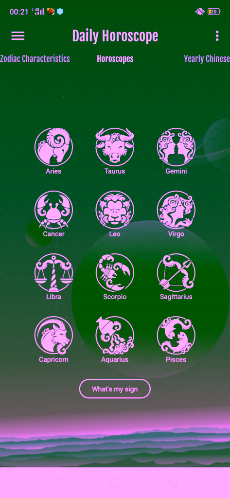 Lagi, ketika kamu membuka aplikasi ini kamu akan langsung dihadapkan dengan 12 zodiak. Untuk ramalan zodiak kamu bisa mendapatkan informasi mengenai zodiak kamu mulai dari harian, mingguan, hingga bulanan. Selain itu aplikasi ini juga memberikan ramalan tentang shio kamu. Dilihat segi UI, background app ini membuat tulisannya sedikit susah dibaca. Namun, setiap ikon yang diberikan cukup menarik.
