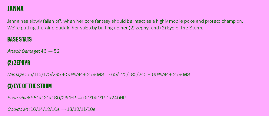 Champion Janna akan mendapatkan beragam peningkatan dimulai dari Base Damage, Skill 2 yang digunakan untuk Poke Damage dan penambahan Movement Speed [Zephyr] dan Skill 3 yang digunakan untuk melindungi teman satu team mu [Eye of The Storm].