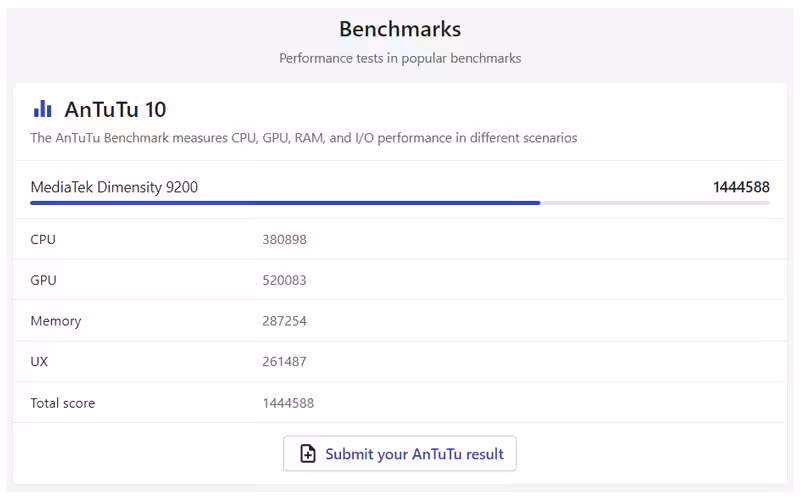 Bila berpatokan pada situs NanoReview, terlihat bahwa chipset Mediatek Dimensity 9200 mencetak skor sekitar 1.445.000 yang terpantau memiliki perbedaan sedikit dari Qualcomm Snapdragon 8 Gen 2 yang memiliki skor 1.515.000.