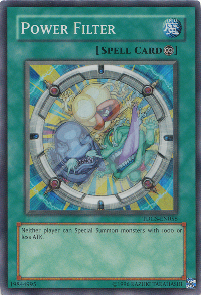 Power filter merupakan kartu yang dapat digunakan untuk mencegah special summon dari monster dibawah 1000. kartu ini berfungsi mencegah pemanggilan dari relinquished dan Tour guide from under world untuk melakukan pemanggilan xyz. Resiko dari penggunaan kartu ini adalah tidak dapat melakukan pemanggilan special atk 1000 dan dibawahnya.