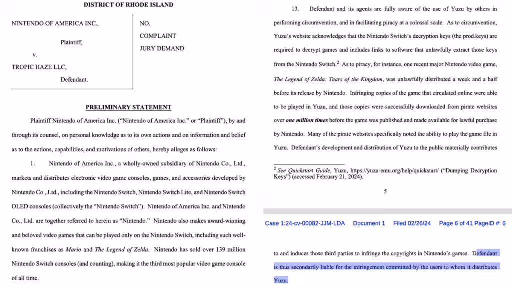 Nintendo kini menuntut pengembang emulator Yuzu di pengadilan Federal US dengan tujuan untuk menutup Yuzu. Dalam tuntutannya yang dibagikan oleh Stephen Totilo, Nintendo menuduh Yuzu melanggar peraturan Digital Millennium Copyright Act atau DMCA.