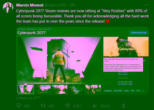 Melalui cuitan Marcin Momot, Global Community director di CDPR mengatakan kalau review game Cyberpunk akhirnya berubah menjadi Very Positive dengan skor 80% disukai oleh gamer.