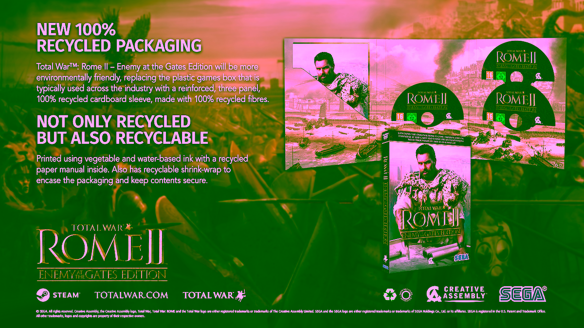 Dilansir dari Gameindustry.biz, langkah yang dilakukan SEGA, khususnya SEGA Eropa ini telah dilakukan oleh anak perusahaannya yang mengerjakan franchise Football Manager, yaitu Sort Interactive Games. SIG beberapa bulan yang lalu telah memperlihatkan case versi fisik dari Football Manager 2020 yang menggunakan bahan baku kardus daur ulang yang juga bisa di daur ulang nantinya. Sekilas box-nya terlihat mirip dengan box game fisik lainnya. Bukan hanya itu saja, SEGA Eropa juga akan melakukan hal yang sama kedepannya untuk rilisan fisik game PC yang lainnya. Seperti halnya Total War: Rome II Enemy at the Gates Edition yang juga akan dibungkus dengan box berbahan baku kardus.