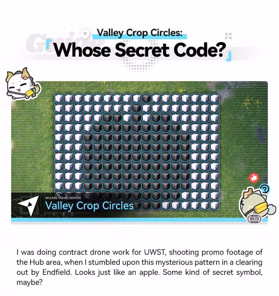 Salah satunya mengenai bagaimana developer menemukan sebuah lahan AIC yang dipenuhi dengan material Cryston Powder dan Dense Carbon Powder dalam kondisi standby. Yang unik adalah lahan tersebut membentuk sebuah desain apel seakan-akan seperti semacam kode rahasia.