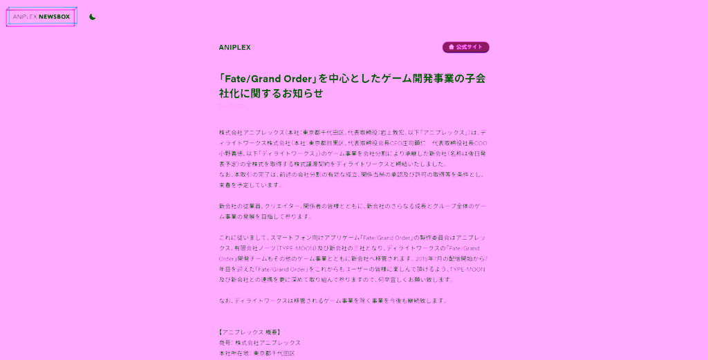 Terkait produksi game smartphone Fate/Grand Order akan dibawah naungan Aniplex dengan nama perusahaan baru. Seluruh jajaran tim pengembang yang ada di Delightworks akan bergabung bersama kami. Kami akan terus melanjutkan kerja sama kami dengan TYPE-MOON untuk melanjutnya game Fate/Grand Order dimana game tersebut telah berjalan selama 7 tahun sejak Juli 2015. Kami berterima kasih banyak kepada semua pihak.