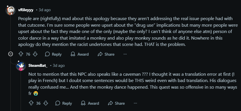Namun, reaksi awal para pemain tampak tak begitu senang. Seperti yang diutarakan oleh pengguna Reddit vRileyyy yang menulis, “Di permintaan maaf ini tidak ada sama sekali yang menyebut nuansa rasis dari adegan itu. ITU masalahnya.”