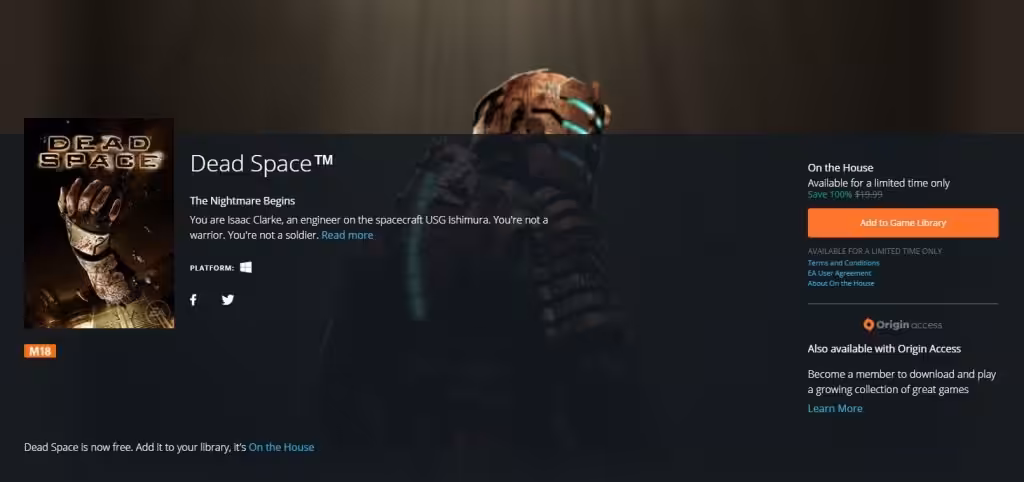 Visceral Games mungkin sudah pergi, akan tetapi karya mereka akan tetap terus dikenang oleh gamer. Mereka adalah studio dibalik Nascar Rumble, Battlefield Hardline, Dante’s Inferno, dan juga trilogi Dead Space. Bicara soal Dead Space, EA mulai dari hari ini berikan game Dead Space secara gratis untuk platform Origin lewat program “On The House”. Game bisa diambil secara gratis dalam waktu terbatas, namun setelah game masuk kedalam library Origin-mu, game akan menjadi milikmu selamanya dan bisa didownload dan dimainkan kapan saja kamu mau.