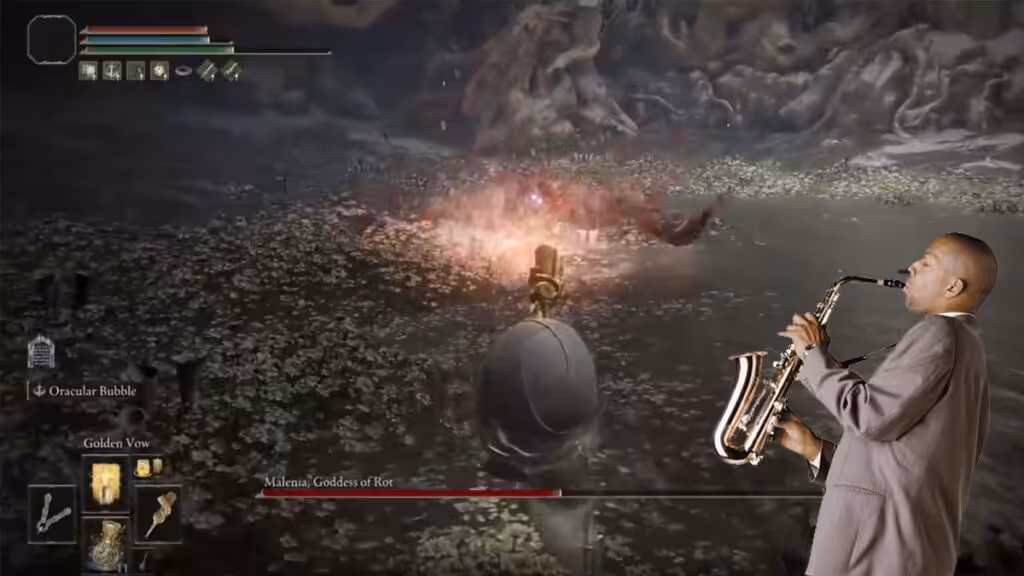 Seorang user di forum Reddit bernama FutureAristocrat membagikan video ia berhasil mengalahkan Malenia Elden Ring dengan meniup gelembung. Hal yang membuat gameplay-nya ini unik adalah, ia melawan boss tersulit itu dengan memutar lagu Jazz.