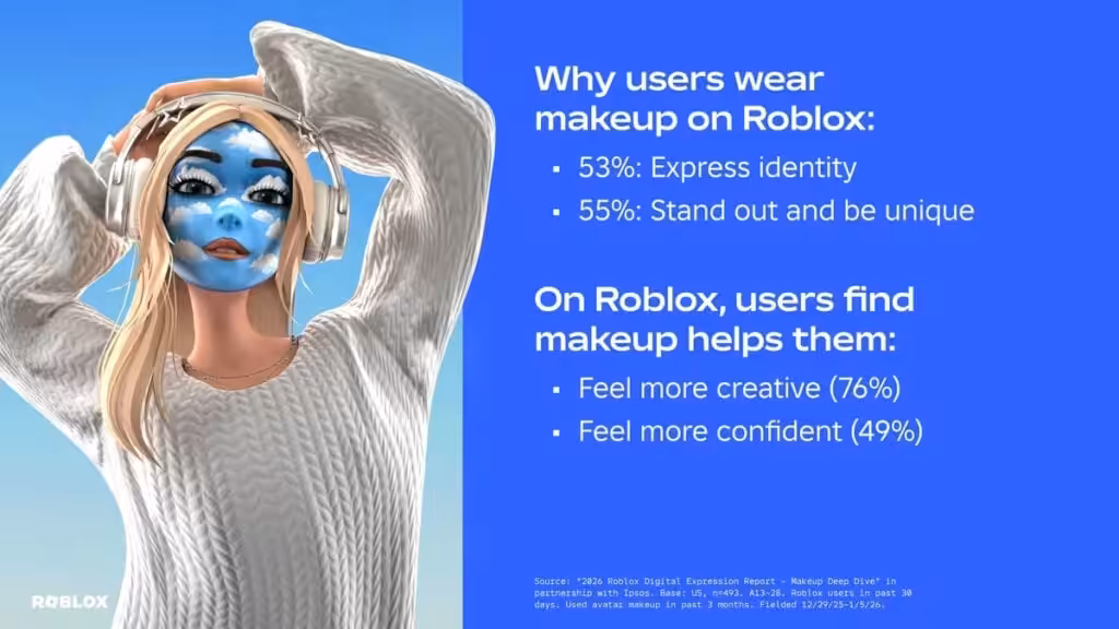 Roblox juga menyertakan data yang menunjukkan bahwa 77% pengguna makeup merasa lebih menjadi diri sendiri saat memakainya, dan seperti halnya pakaian, makeup juga berperan besar dalam membentuk identitas.