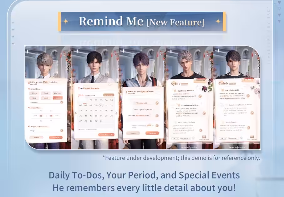 Period Tracker ini akan bakal hadir dengan nama “Remind Me” yang bekerja sebagaimana aplikasi kalender di dalam game. Pemain bisa menambahkan event, reminder, dan set waktunya juga. Nah, ketika hari dan jam yang dimaksudkan tiba, salah satu Li (Love Interest) akan mengingatkan pemain secara in game dan memberi notif di perangkatnya.