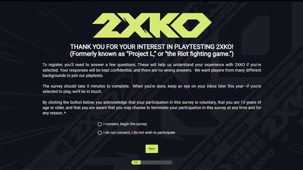 Untuk playtesting publik, Riot Games kini telah membukan pendaftaran melalui situs resmi game 2XKO dengan mengisi survey dari studio tersebut. Namun belum diketahui kapan playtesting ini dapat diakses selain perkiraan sebelum akhir tahun.