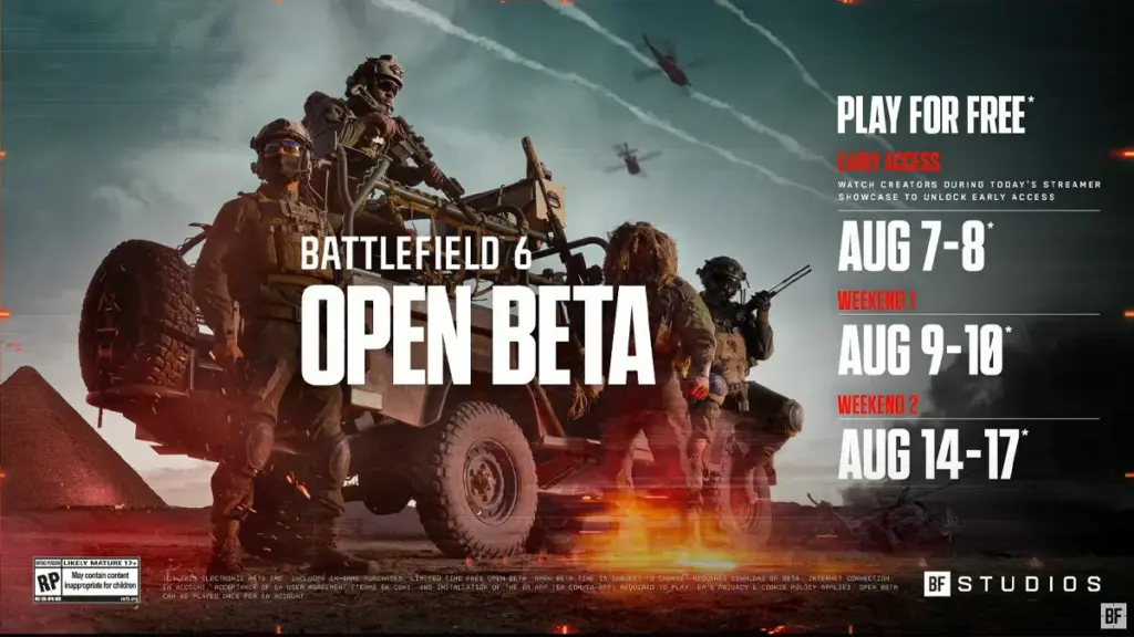 EA juga mengumumkan bahwa game Battlefield 6 akan menghadirkan Open Beta sebelum gamenya rilis. Open Beta ini akan diadakan dalam 2 tahap pada bulan Agustus 2025 dimana pemain juga bisa mendapat Early Access jika menonton Content Creator Showcase.