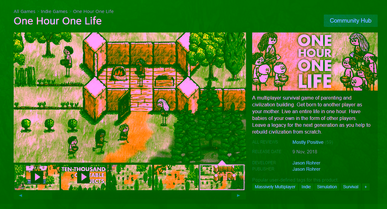 Guna menyegarkan kembali ingatanmu, kabar mengenai keberadaan game buatan Jason Rohrer ini sebelumnya sudah lama pernah kami angkat dan kenalkan kepada kalian. Hanya saja, pada waktu itu aksesmu untuk memainkan game One Hour One Life sangatlah terbatas karena hanya dapat dibeli via paypal di situs resmi gamenya. Namun sekarang, kalian semua pengguna PC di Indonesia kini sama-sama punya kesempatan untuk dengan mudah menjajal game ini langsung di platform game digital paling merakyat sedunia, yaitu Steam.
