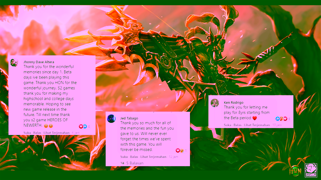 “Terimakasih atas kenangan yang sangat indah sejak hari pertama. Aku sudah bermain game ini sejak masih BETA Test. Terimakasih HoN atas perjalanannya yang indah. S2 Games (Developer HoN), terimakasih sudah membuat hari – hari semasa aku SMA dan Kuliah menjadi sangat berharga. Aku berharap akan ada game baru kedepannya. Sampai saat akan tiba nanti, terimakasih S2 Games dan Heroes of Newerth” komentar Jhonny Dave Altera.