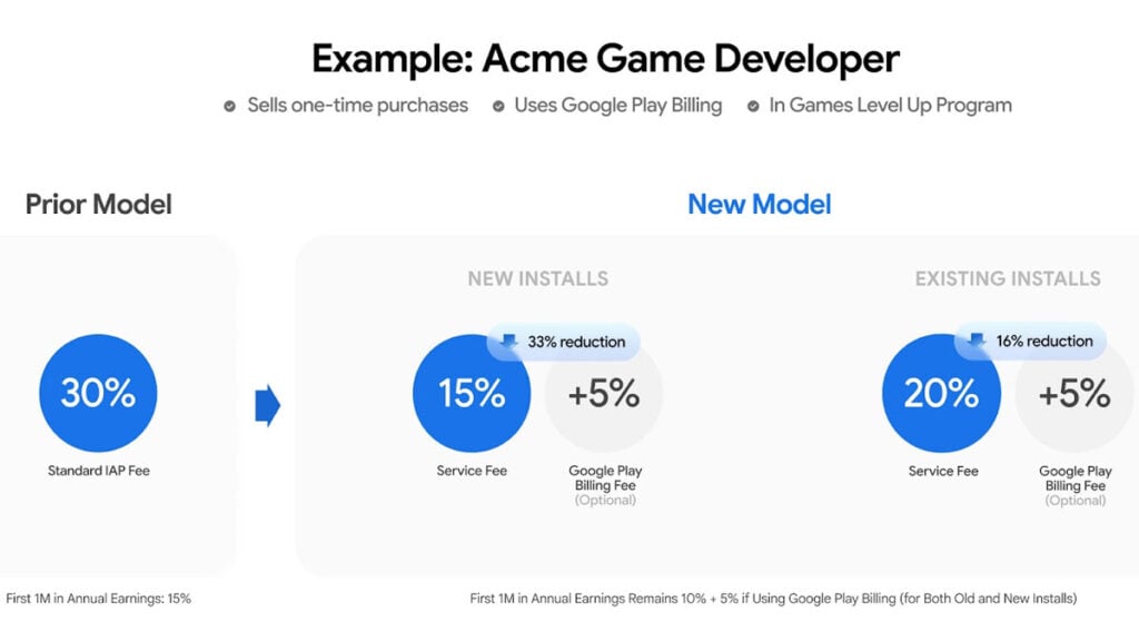 Selain potongan biaya layanan, Google juga memberikan kebebasan bagi developer untuk menggunakan sistem pembayaran mereka sendiri atau mengarahkan pengguna ke situs web eksternal untuk melakukan transaksi. Bagi developer yang masih ingin gunakan Google, biaya layanan untuk langganan rutin (recurring subscriptions) bahkan dipangkas hingga 10%.