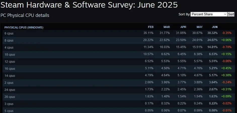 Selain kartu grafis, beberapa penyesuaian juga terjadi di bagian prosesor yang digunakan oleh para gamer di platform tersebut. Di mana perlahan prosesor 6 core terlihat berkurang popularitasnya lagi di bulan Juni dengan penurunan sebesar 0.35%. Di sisi lain, prosesor 8 core terlihat stabil dengan peningkatan 0.06% di bulan Juni.