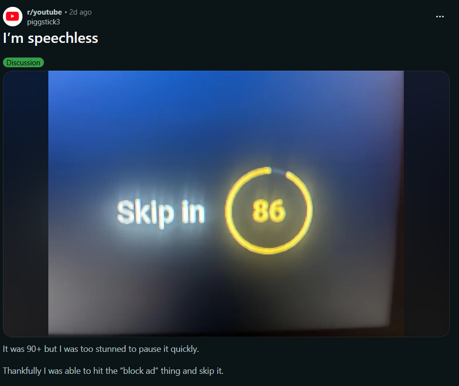 Anehnya iklan tersebut memiliki durasi yang tidak wajar ketika menontonnya tanpa membeli layanan langganan bulanan Premium yang ada ada pada platform. Seperti yang ditemukan oleh pengguna akun Reddit bernama piggstick3 dimana dia menemukan iklan tersebut memiliki durasi 90 detik. Lebih parahnya lagi iklan itu aslinya tidak bisa di-skip secara normal dan untungnya dia bisa melewatinya berkat semacam “Block Ad”.