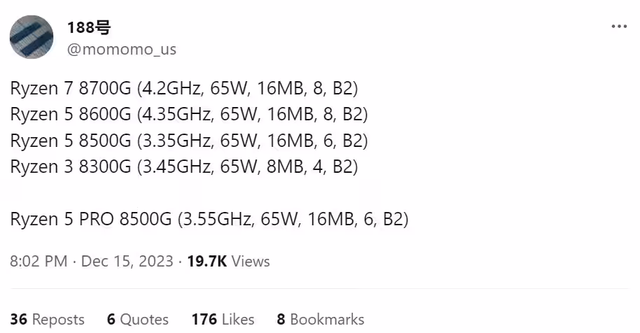 Berikut adalah spesifikasi resmi AMD Ryzen 8000G tersebut secara singkat, dengan mengacu bocoran leaker momomo_us di platform X.
