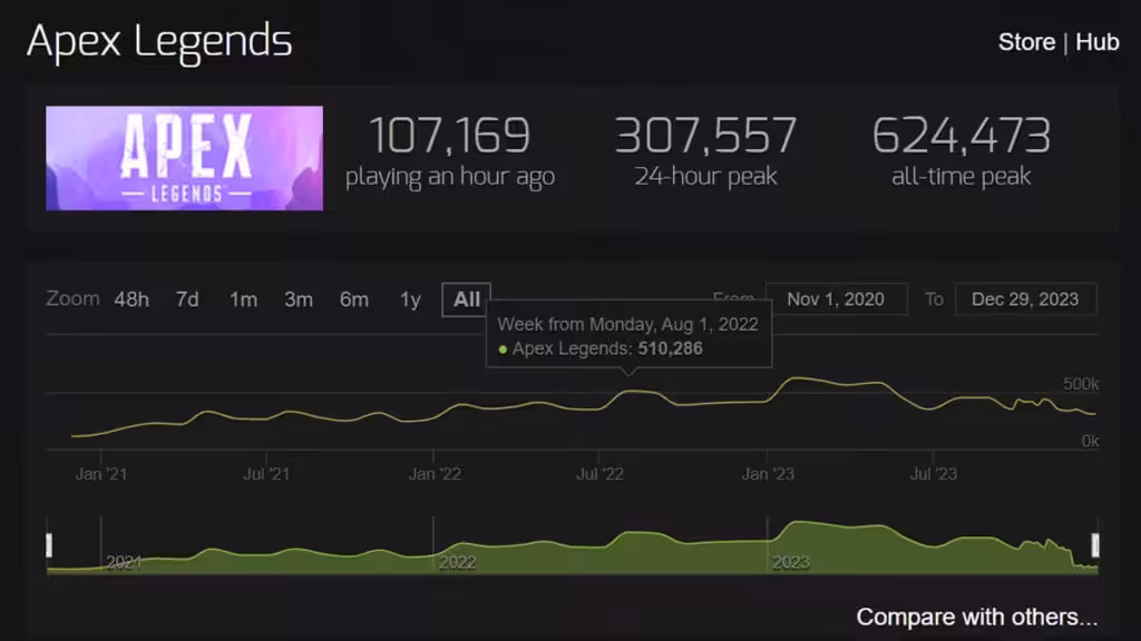 Sepertinya jumlah pemain Apex Legends semakin menurun semenjak permasalah server pada bulan Juli 2023. Hal ini terlihat pada grafik Steam Charts yang memperlihatkan game memiliki jumlah pemain terendah semenjak Desember 2021.