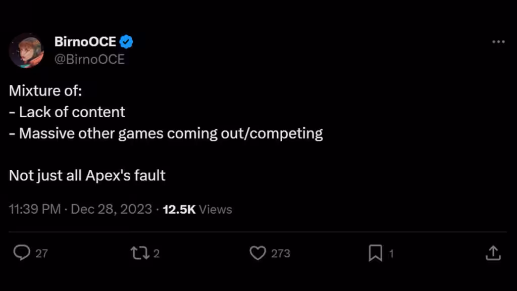 Merespon cuitan Twitter akun tersebut, salah seorang Content Creator yaitu BirnoOCE menjelaskan hal yang membuat pemain game Apex Legends menurun. Menurutnya terdapat 2 faktor berbeda.