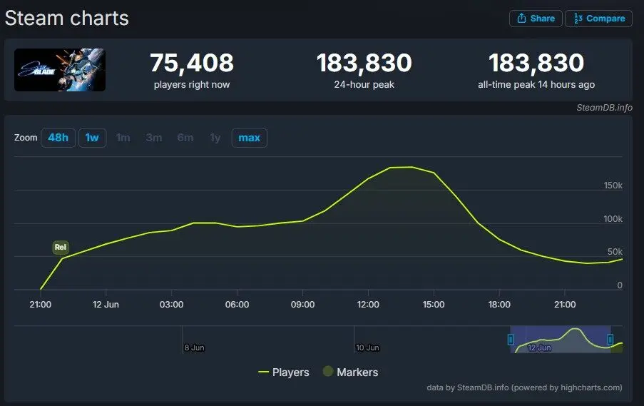 Berdasarkan informasi dari SteamDB, jumlah puncak Player Stellar Blade telah mencapai 183.830 Pemain di Steam terhitung pada saat artikel ini ditulis (13/06).