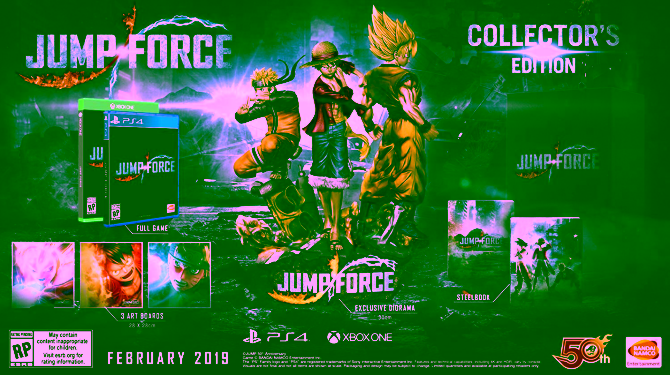 Versi collector’s edition dari Jump Force ini nantinya akan berisikan steelbook, 3 buah art boards, base game, dan sebuah diorama berukuran 30cm dengan karakter Naruto, Lufy, & Goku. Collector’s edition ini dibanderol seharga $260, bagi kalian yang melakukan pre order Jump Force, baik versi collector maupun standard akan menerima bonus berupa sebuah kendaraan lobby & 3 buah kostum eksklusif di dalam gamenya.