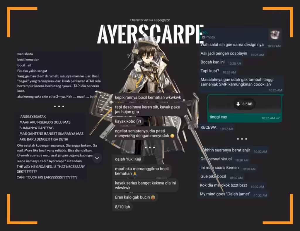 Ketiga kerabat saya ternyata langsung menyangka bahwa sang bodyguard Catastrophe Messenger asal Rim Biliton ini adalah seorang bocil kematian. Tidak bisa dipungkiri memang karena desain visual Aterscarpe yang terlihat masih seperti anak remaja.
