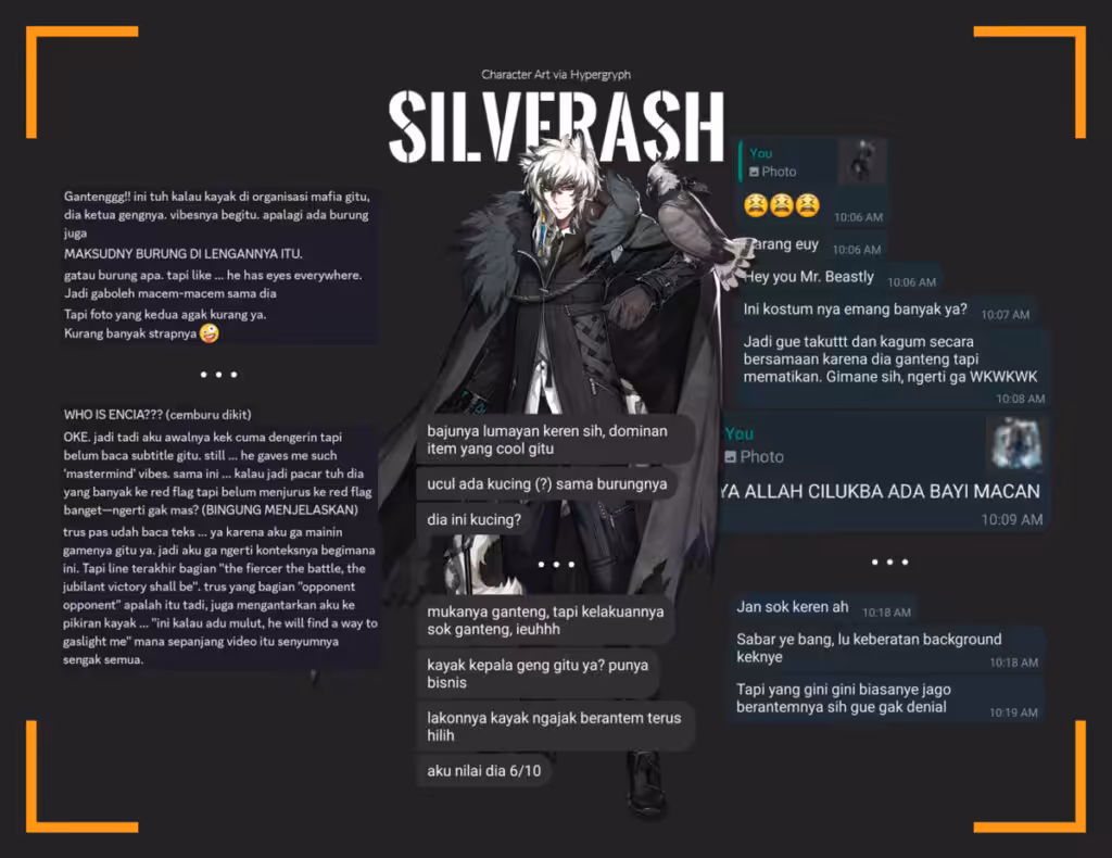 Terlepas SilverAsh kini menjadi unit DPS yang tidak lagi populer di Arknights, ketiga kerabat saya setuju bahwa bos besar dari Karlan Trade Co., Ltd. ini terlihat tampan (dan berani), dan terpincut dengan hewan peliharaannya.