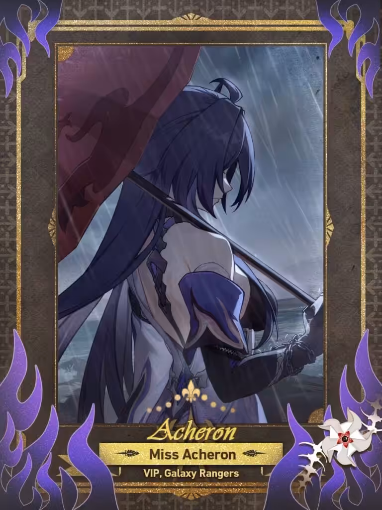 - Eidolons: (E1) Ketika Debuff diaplikasikan ke musuh, meningkatkan %Attack dan %Critical Chance pada Acheron sampai akhir encounter. Bisa ditumpuk sebanyak x Stacks. (E2) Mengurangi A4 syarat Nihility sebanyak 1. Pada awal giliran Acheron, 1 Flowers akan ditambahkanke musuh dengan Flowers paling banyak. (E4) Pada awal Ultimate-nya, memberikan efek Debuff pada semua musuh meningkatkan Damage diterima sebesar X% selama X Turn. (E6) Ultimate Acheron menerima peningkatan Critical Damage sebesar X%. Ketika Acheron menggunakan Basic Attack maupun Skill, itu akan dihitung sebagai Ultimate Attack.