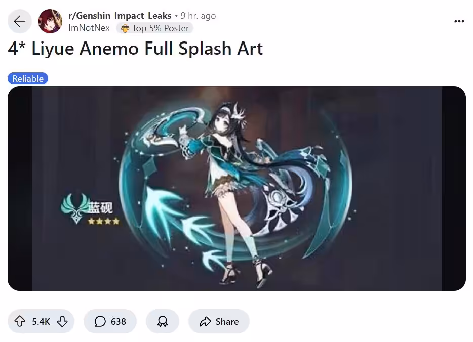 Bocoran ini datang dari leaer Seele Leaks via Uncle Teyvat, yang membagikan bocoran splash art Lanyan kepada pada penggemar. Menurutnya, Lanyan akan menjadi karakter Genshin Impact dengan rarity B4, senjata Polearm dan elemen Anemo. Kalian bisa lihat sendiri penampakannya di bawah ini: