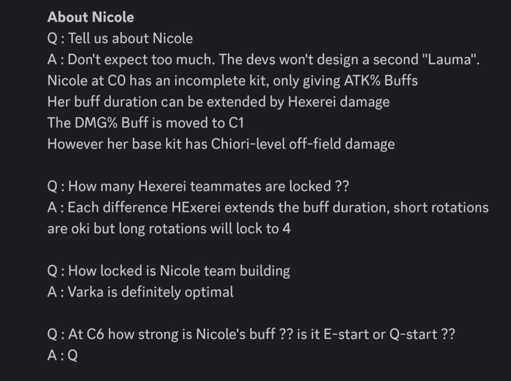 Dalam bocoran yang dibagikan oleh leaker BinaMains. dikatakan bahwa kit Nicole mungkin tidak sebroken Lauma dan hanya memberikan buff ATK% dengan Elemental Burst-nya di C0. Selain itu, DPS-nya mirip dengan Chiori.