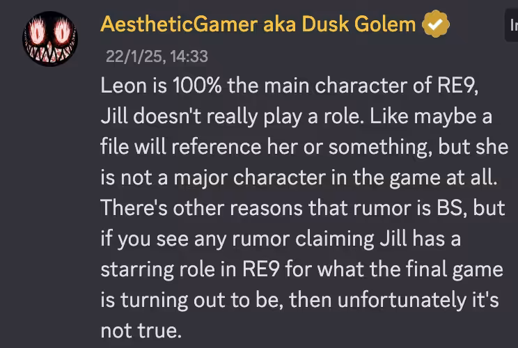 DuskGolem mengatakan dengan lantang bahwa Resident Evil 9 hanya akan hadirkan Leon sebagai Protagonist di gamenya nanti. Ia juga mengklaim dirinya yakin hingga 100% bahwa Leon pasti akan hadir kembali di RE9 nanti. Bahkan dia mencoba megoreksi rumor sebelumnya yang menyebutkan kalau Jill menjadi Protagonist utama di RE9 nanti ternyata tidak sepenuhnya benar.