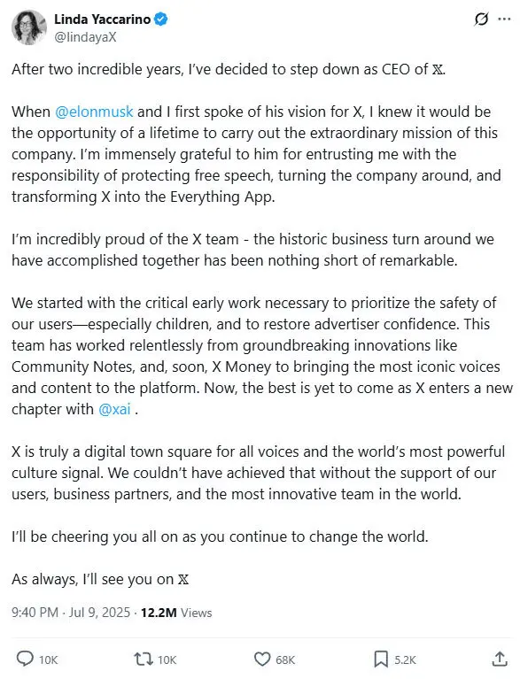 Sebagaimana yang dicuit oleh dirinya belum lama ini, dirinya menjelaskan bahwa mundurnya ia dari kursi CEO Twitter X merupakan keputasan yang ia ambil sendiri. Bahkan ia menyampaikan rasa terima kasihnya kepada Elon Musk karena telah memberikannya kesempatan untuk mengubah X menjadi aplikasi serbabisa.